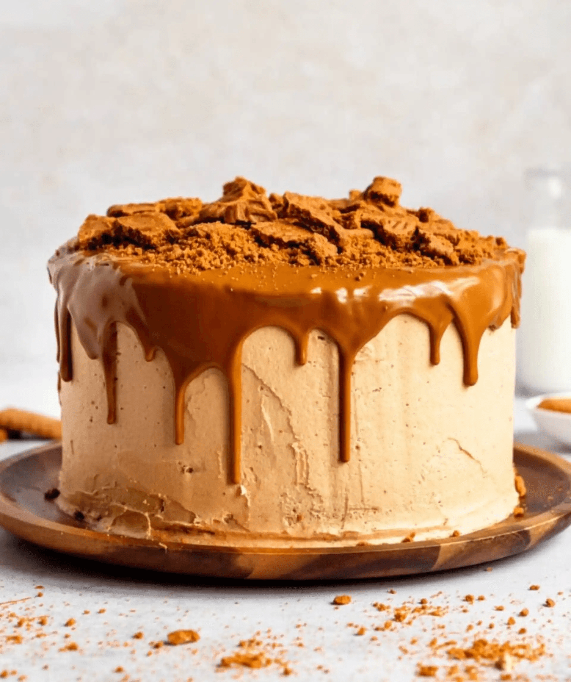 Two-layer 8-inch yellow cake infused with homemade caramel and Biscoff cookie crumble. Iced with whipped caramel buttercream and finished off with caramel drizzle.
