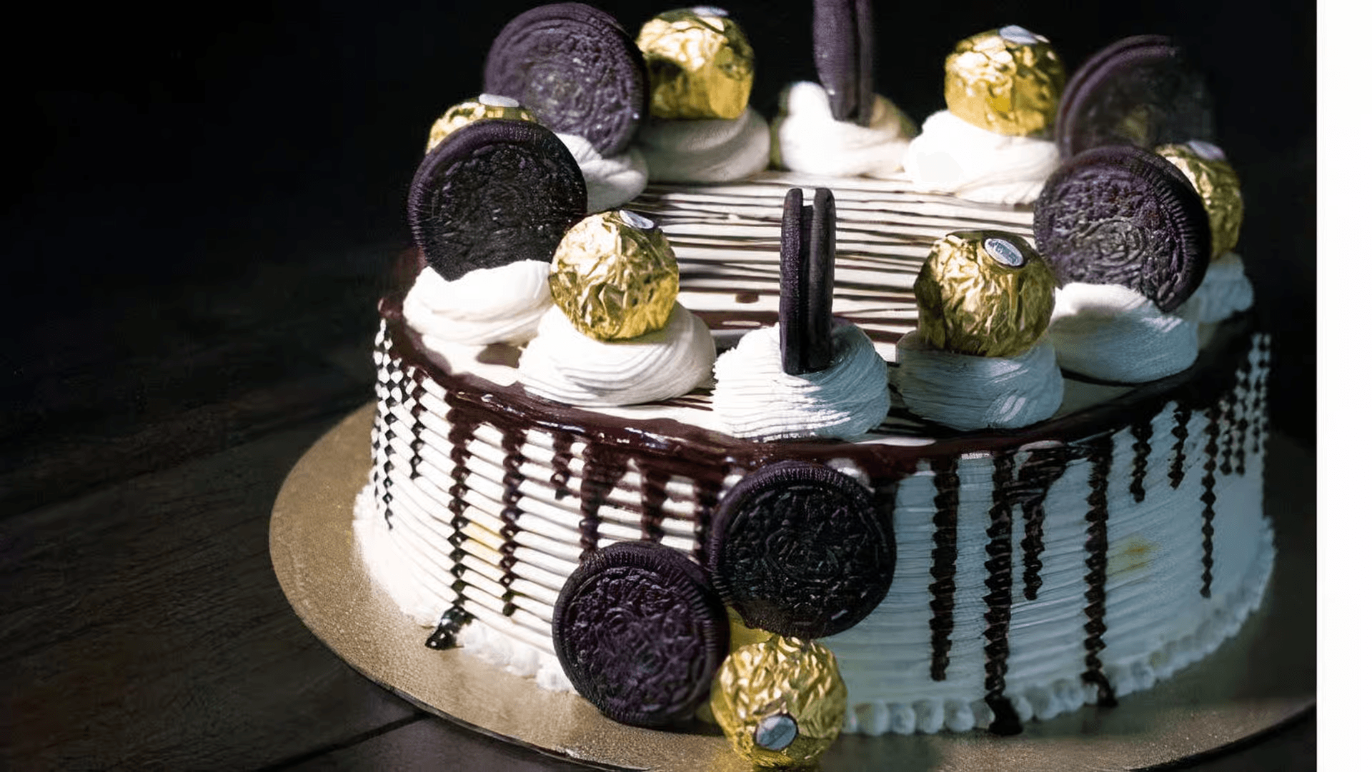 Two-layer 8-inch fudge cake infused with Oreo buttercream with Oreo cookies and fudge drizzle.