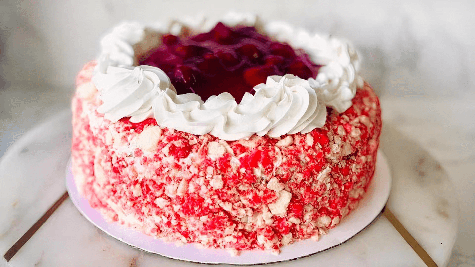 Two-layer strawberry cake infused with whipped buttercream, covered in strawberry shortcake crumbs and topped with strawberry topping.